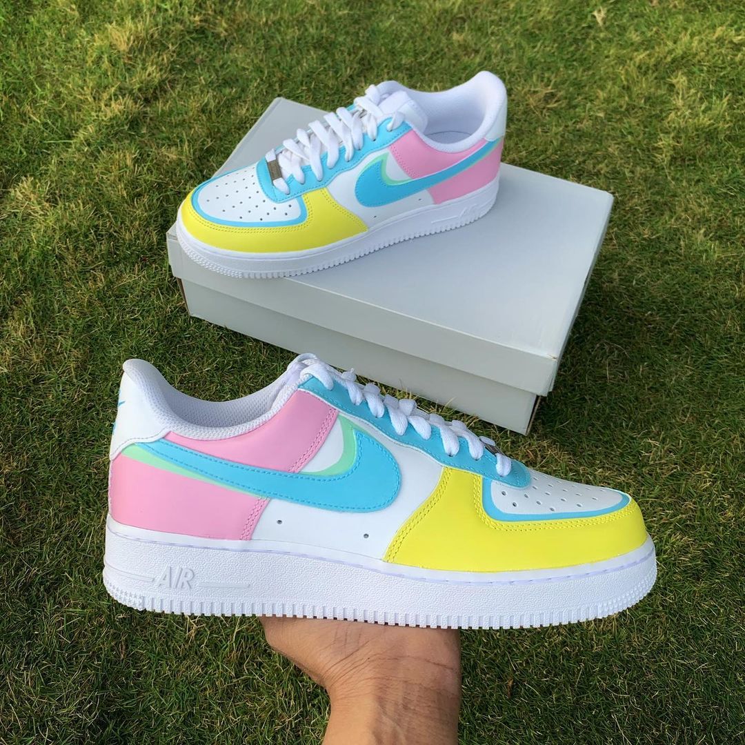 Step into sweetness with the Air Force 1 Custom – Candy edition. Featuring a vibrant pastel palette of yellow, pink, mint, and sky blue, this design transforms the classic Air Force 1 into a lively, playful masterpiece. Each pair is custom hand-painted with high-quality materials to ensure durability and boldness in every step. Ideal for sneaker lovers who crave uniqueness and charm, this Air Force 1 Custom adds a sugary touch to any streetwear or casual outfit. Perfect for spring vibes, colorful fashion, or standing out in every crowd with your custom drip.