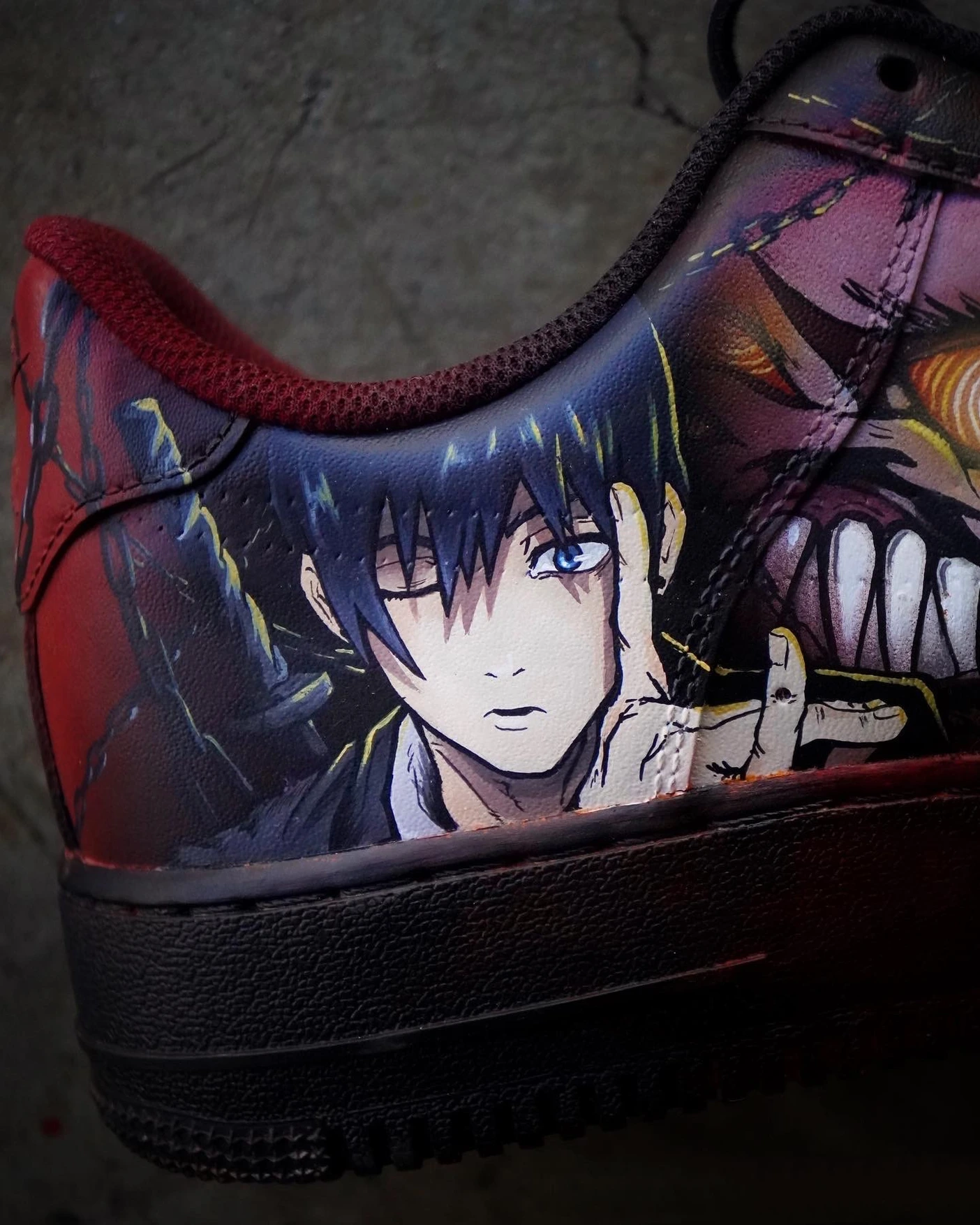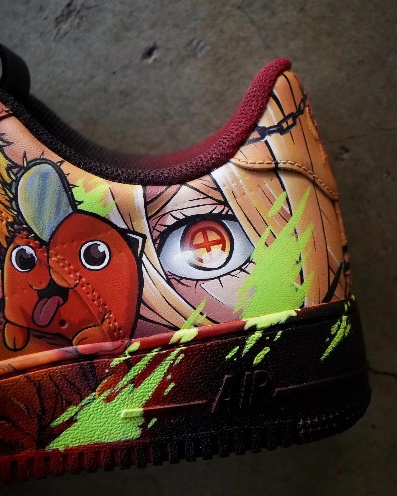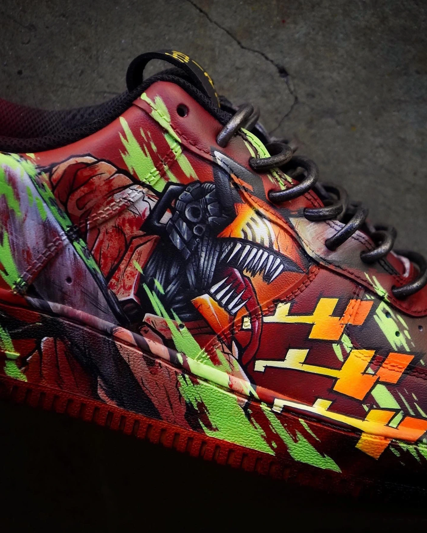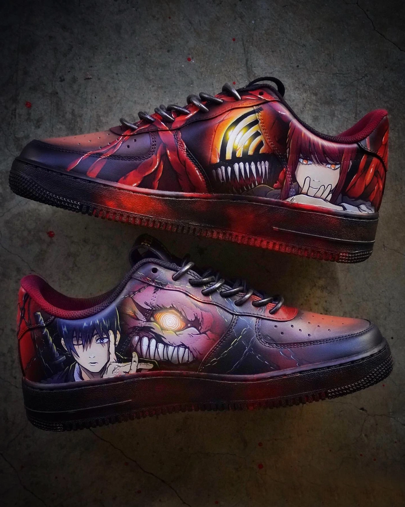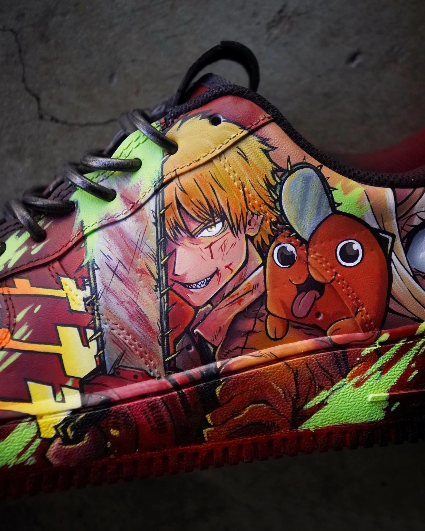 Dive into devil-slaying style with this explosive Air Force 1 Custom – a limited edition tribute to Chainsaw Man. Featuring vivid, hand-painted artwork of Denji, Pochita, and iconic action scenes, the design bursts with blood-red, neon green, and orange lightning accents across a deep black and crimson base. Every brushstroke captures the raw energy and intensity of the anime. Built for true fans and collectors, this Air Force 1 Custom isn’t just a shoe—it’s a power-packed statement. Each pair is a handcrafted, one-of-a-kind collectible that blends anime heat with streetwear grit.