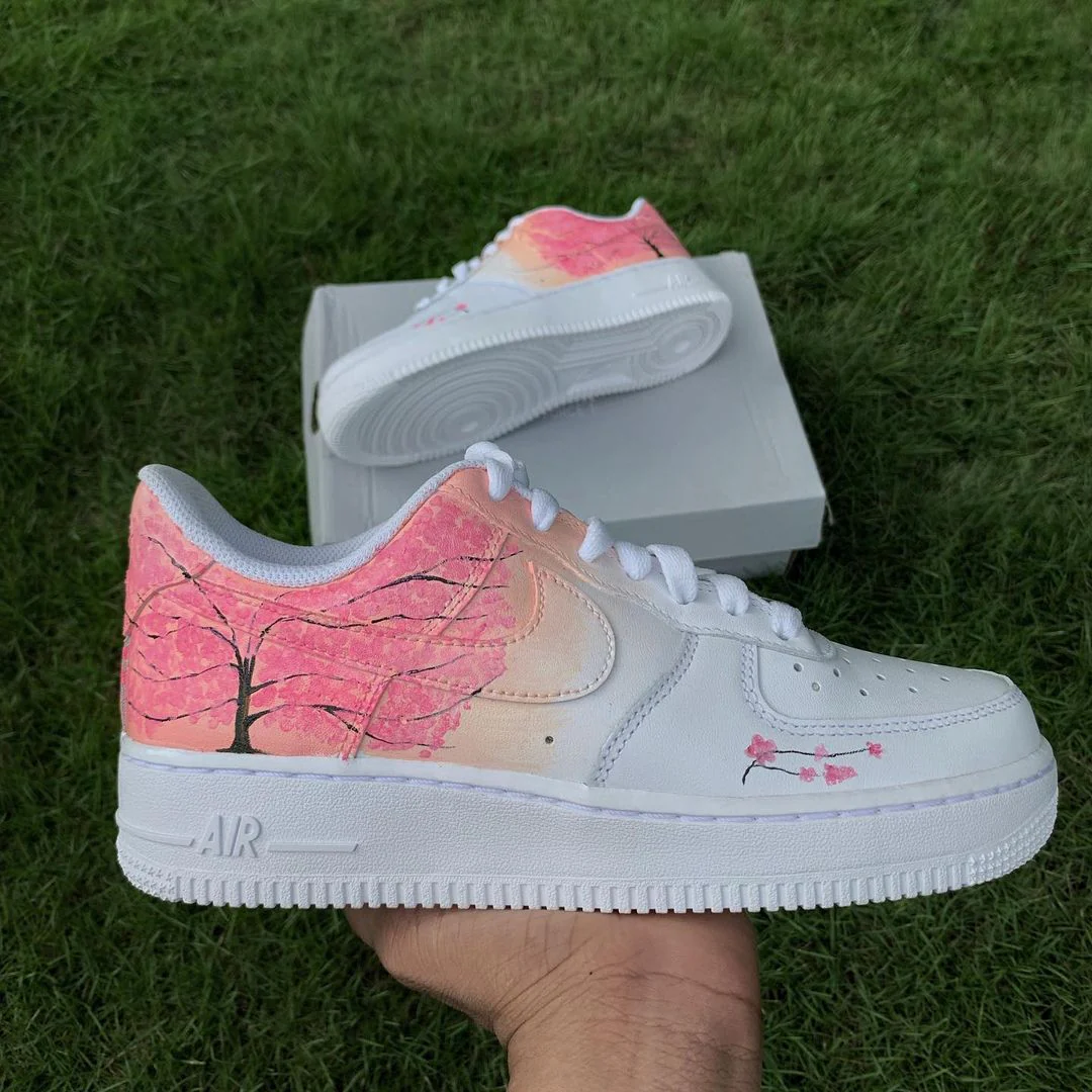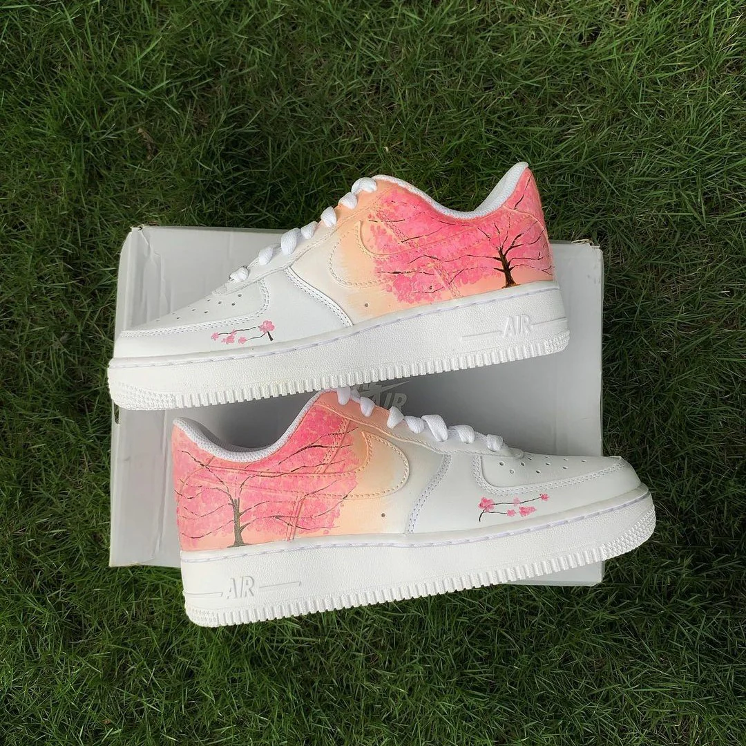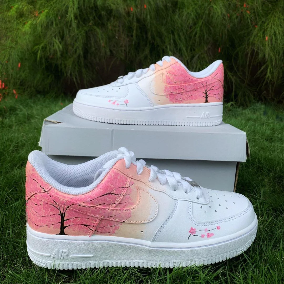 Step into spring with this delicate and elegant Air Force 1 custom featuring a hand-painted cherry blossom design. Inspired by the beauty of sakura season, this pair blends soft peach, blush, and rose tones to create a calming gradient sunset backdrop. Detailed cherry blossom trees and petals stretch across the heel and toe panels, adding poetic charm to every step. Crafted on clean white Nike Air Force 1s, this air force 1 custom is perfect for nature lovers, artists, and anyone seeking a graceful touch to their sneaker game. Limited edition—bloom with style while it lasts.
