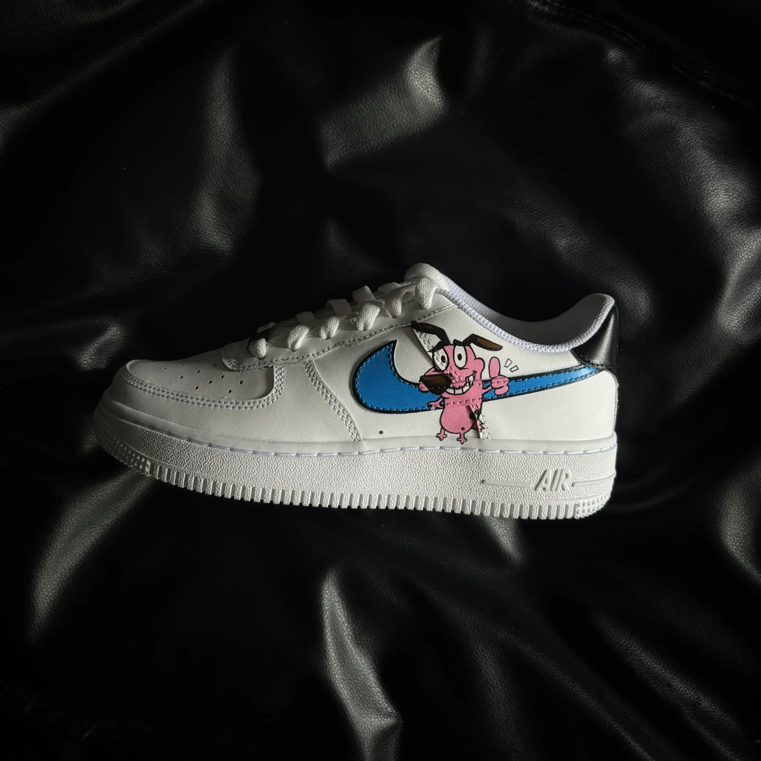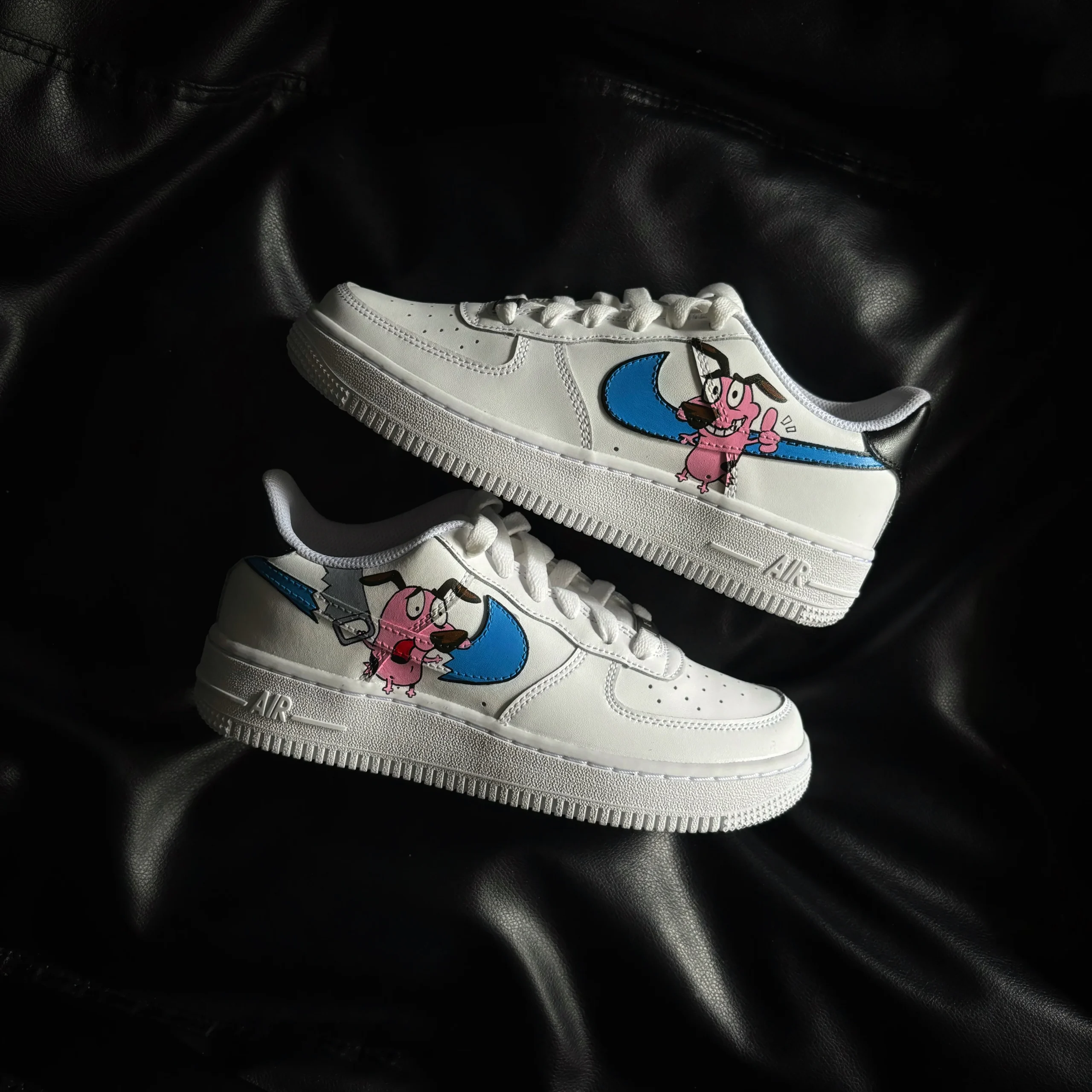 Step into animated nostalgia with this unique Air Force 1 Custom showcasing Courage the Cowardly Dog in a bold, hand-painted design. Set against a clean white leather base, the playful artwork features Courage in classic cartoon panic, framed by a striking blue Nike Swoosh. Whether you’re a Cartoon Network fan or a lover of quirky streetwear, this Air Force 1 Custom blends childhood memories with sneaker culture in the best way possible. Each pair is carefully hand-crafted to ensure vivid color, durability, and one-of-a-kind style for collectors and fans of animated icons.