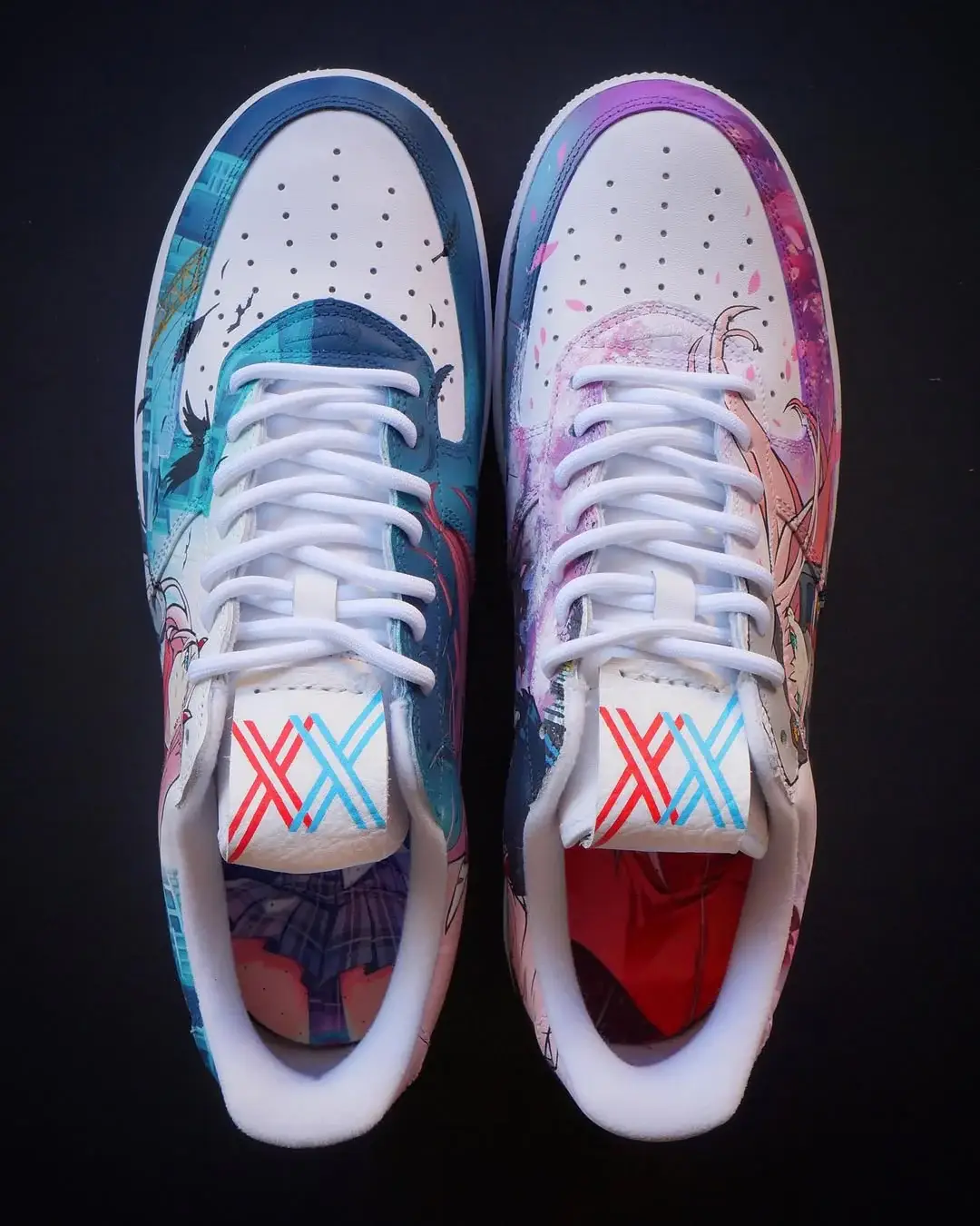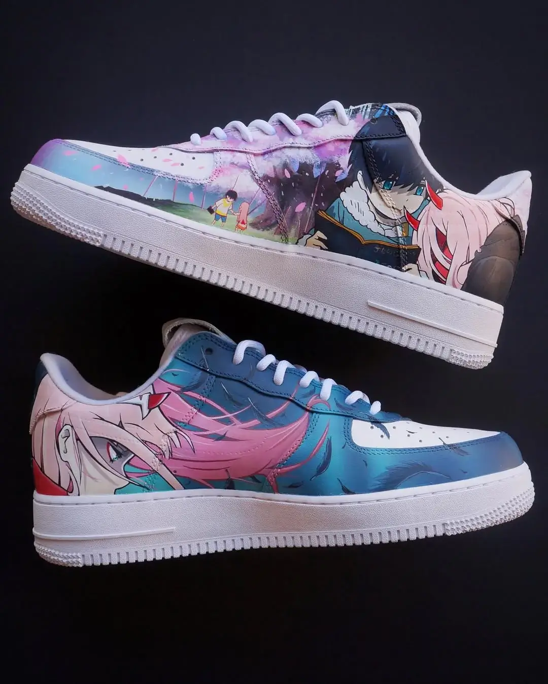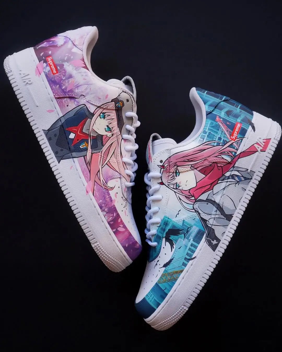 Step into a futuristic fairytale with this beautifully designed Air Force 1 custom inspired by Zero Two from Darling in the Franxx. Featuring two striking scenes—one set in soft pink cherry blossom tones and the other in a cool, modern cityscape—this pair captures both Zero Two’s elegance and fierce independence. Rendered on authentic Nike Air Force 1s with crisp anime detailing and pops of Supreme red, this custom merges anime culture and streetwear perfectly. For true fans of “002,” this Air Force 1 custom is the ultimate tribute to style, story, and identity.